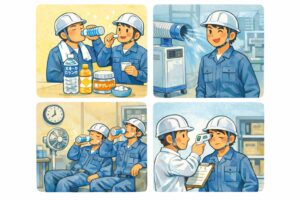 → 「のどが渇く前」に補給させる教育が必要です。スポーツドリンクや塩飴の常備だけでなく、補給時間を業務に組み込むことが効果的です。単独作業の回避